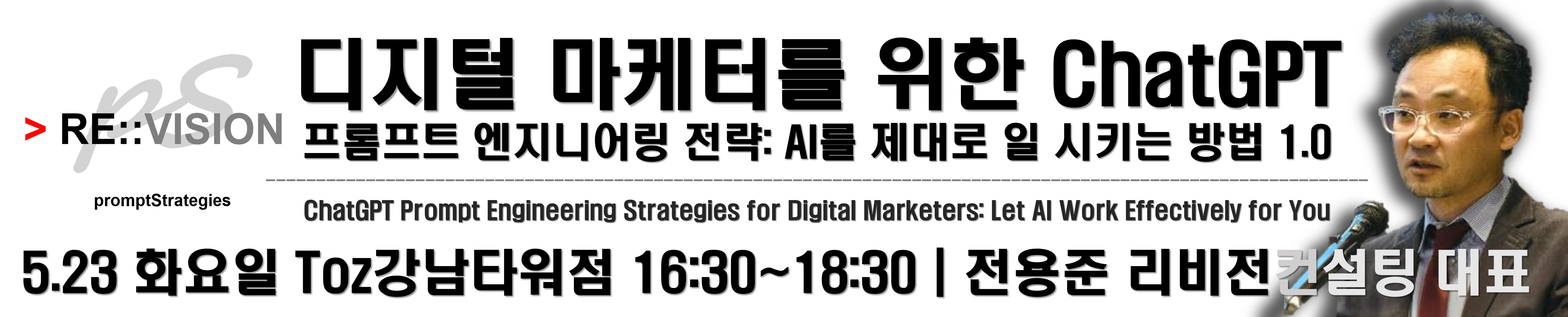 "CEO/CXO와 리더를 위한 ChatGPT (ChatGPT for CEO/CXO and Leaders: Strategic Perspective)"는 Revision Consulting [ promptStrategies ]에서 설계한 2시간 분량의 강의 모듈로, ChatGPT의 능력, 한계 및 기업에 미칠 수 있는 영향에 대한 종합적인 이해를 제공합니다. 이 응축된 강의를 통해 기업 리더들은 전략적 관점에서 ChatGPT 어떻게 계획, 운영, 평가에 효과적으로 적용할 것인지를 파악할 수 있습니다.