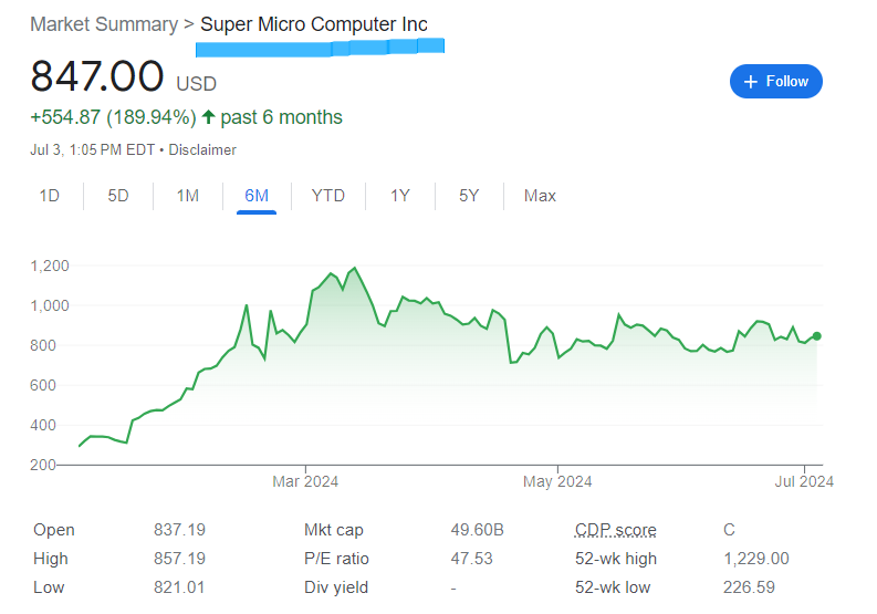 >> 일단 한 종목을 선정했다면 (여기서는 SMCI를 예제로) 주가 추이부터 검토해 볼 일이다.