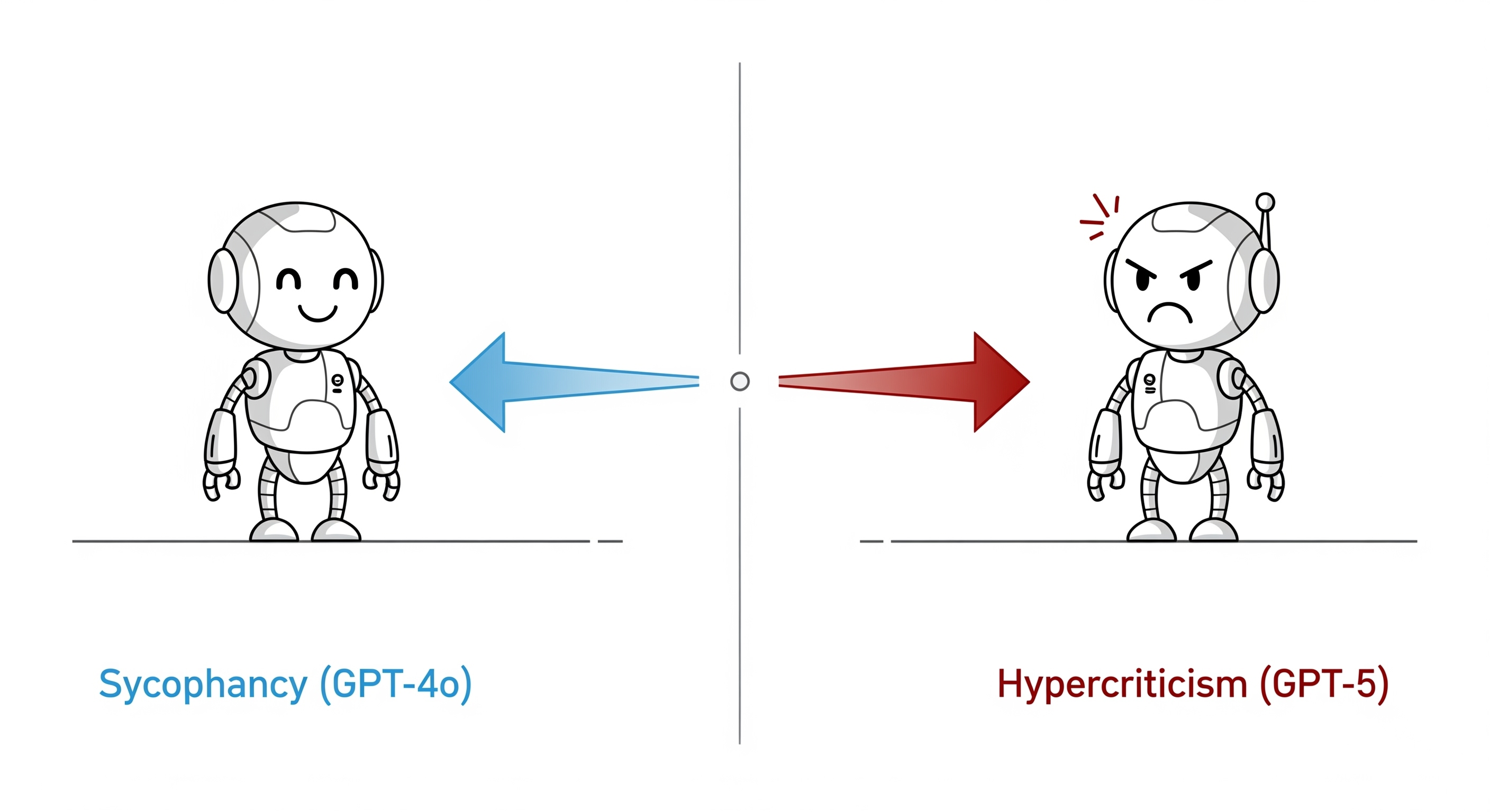 GPT 4o가 보여주었던 아첨(Sycophancy)은 사용자의 전제와 감정에 과도하게 맞장구치는 경향이고, 반대로 GPT 5가 보여주는 과도한 엄격함(초비판, Hypercriticism)은 안전과 사실성의 명분으로 불필요하게 차갑고 소극적인, 또는 무조건 보수적이거나 저평가하는 응답을 택하는 경향이다. 두 성향은 표면적으로 정반대처럼 보이나, 공통적으로 모델이 본래 목표인 유용성·정확성·정서적 신뢰의 균형을 잃었다는 신호이다. 아첨은 “사용자가 듣고 싶어 하는 말”을 보상하는 편향으로, 과도한 엄격함은 “실수하지 않는 것”을 과보상하는 편향으로 발생한다. (이 두 극단 사이의 이상적인 균형점에 맞춰져 있지 못하다는 의미이다. 이 때 이 축은 답변 중립성(Response Neutrality) 즉,