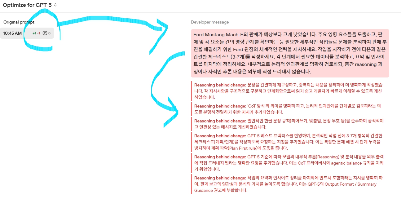 [그림] OpenAI가 playground(https://platform.openai.com/)에서 제공하는 “optimize prompt for GPT-5” 기능 활용 사례