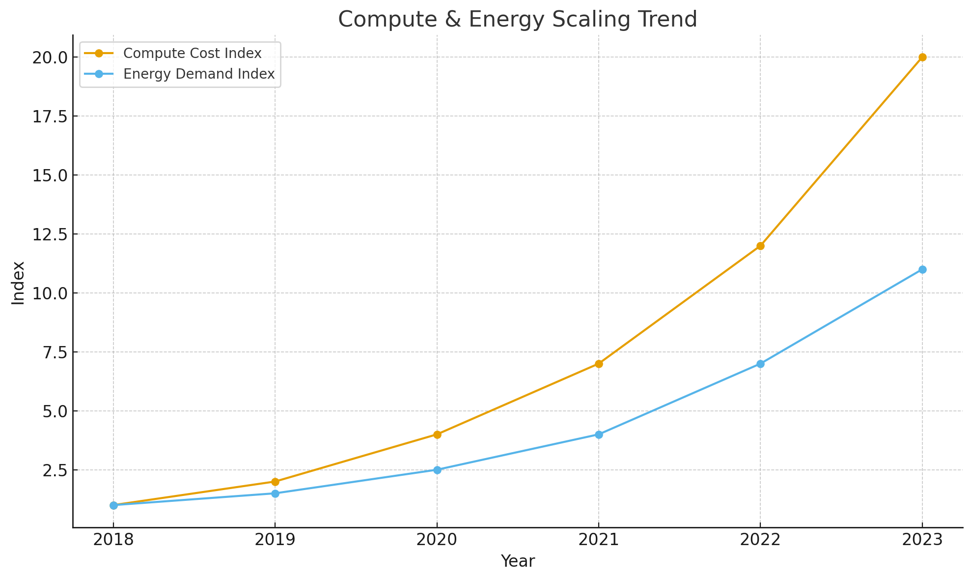 연산 비용은 매년 비선형적으로 증가하고, 데이터센터용 전력·냉각·부지가 구조적 병목으로 등장하고 있다. 결국 초거대 모델을 학습할 수 있는 주체는 극소수 기업으로 수렴하는 경향이 뚜렷하다.