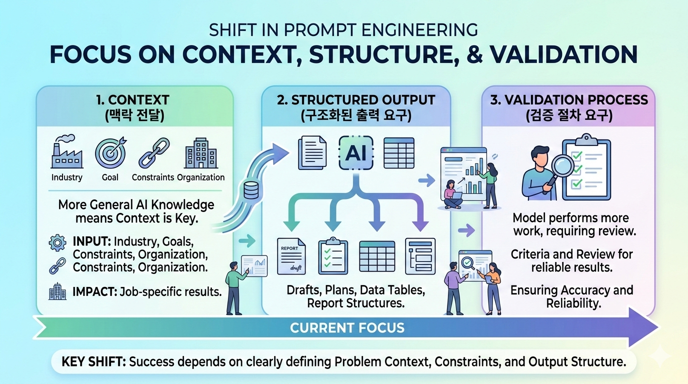 초기에는 문장 표현이 핵심 변수였다. 지금은 문장 표현과 상황 정보가 함께 작동하는 구조가 되었다. 프롬프트 기술은 여전히 필요하지만, 그 중심은 표현 기술이 아니라 정보 구성 능력에 있다.